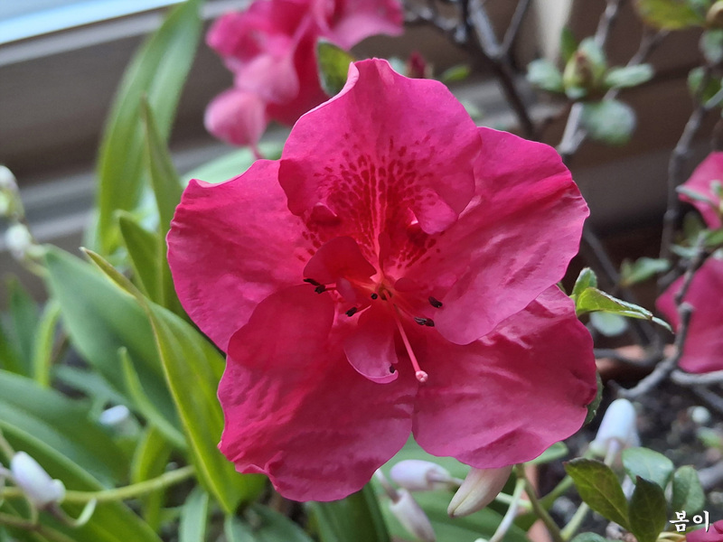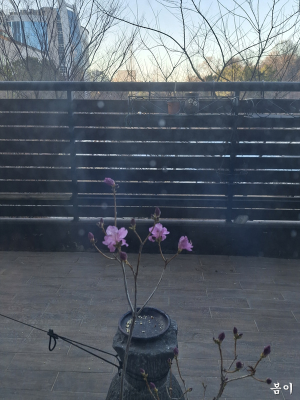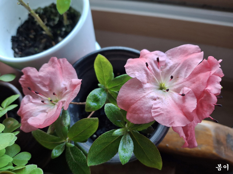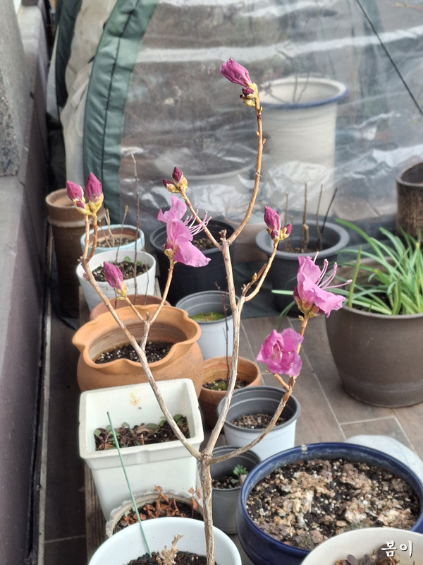 작은분에 왜철죽이 첫꽃을 피고...